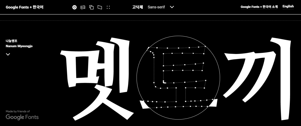 Hangul is a writing system that is one of the most phonologically faithful in the world. You almost always see what you pronounce. Each glyph in Hangul is a syllabic block. Google created this site showcase the Korean typefaces that they have and how they can be flexibly applied to web design. A lens guide you through each glyph revealing Adobe Illustrator-like anchor-points-and-stroke structure. All the fonts there are open sourced and available through Github.